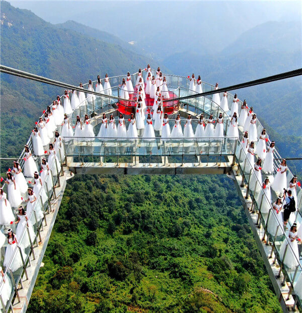 天空懸廊,由透明防滑玻璃搭建而成,懸空在300米高的懸崖上,向懸崖探出69.6米。懸廊呈“A”字形,橋面鋪設(shè)全透明玻璃,從內(nèi)往外由寬漸窄,比美國亞利桑那州科羅拉多大峽谷空中的玻璃走廊長3倍多,恢弘大氣值得游客前來觀光體驗(yàn)。